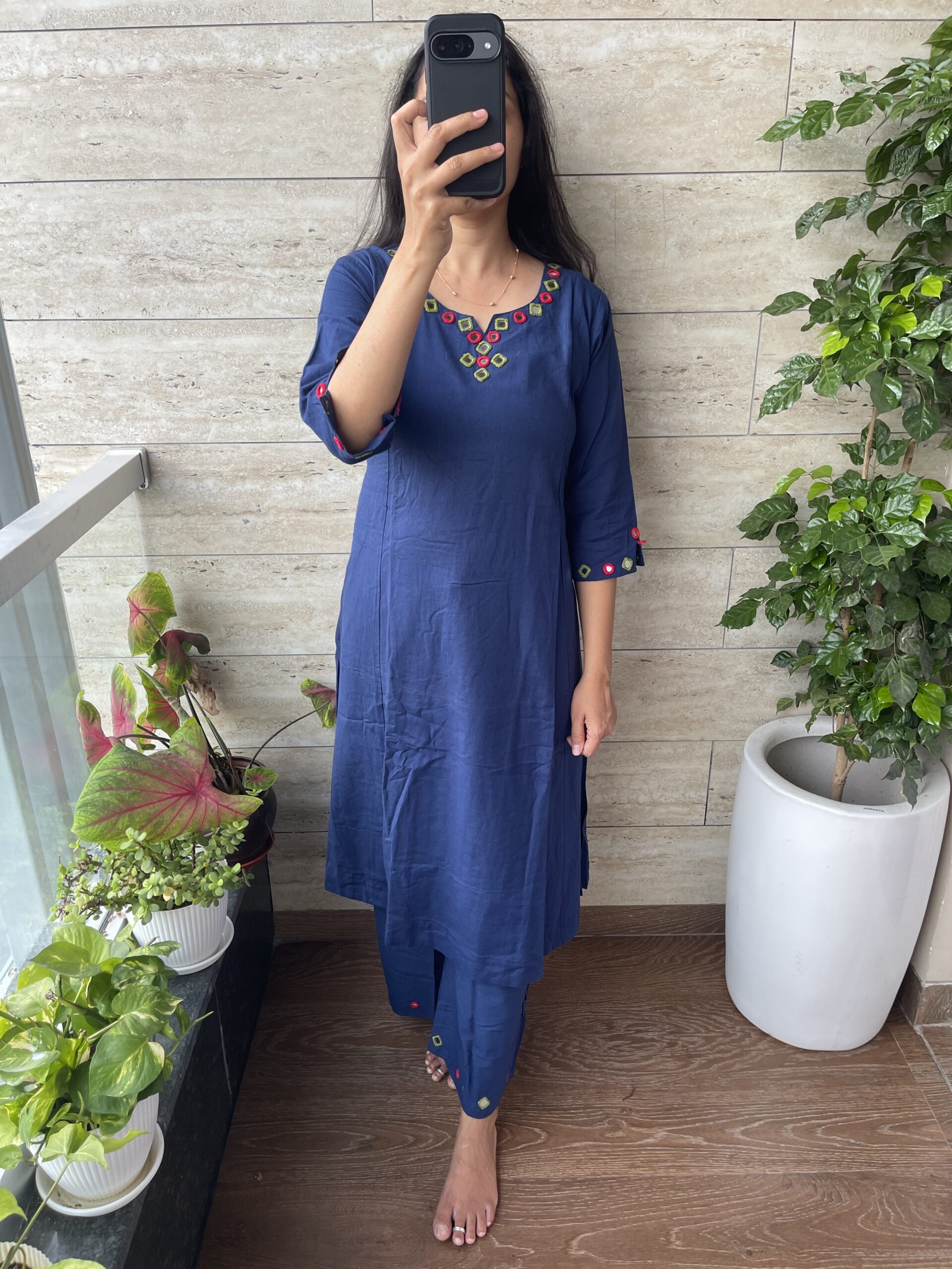Be the first to review “AV58- Premium Flex Cotton Handmade Mirror Embroidery A Line 2Pc Kurta & Pant Set”