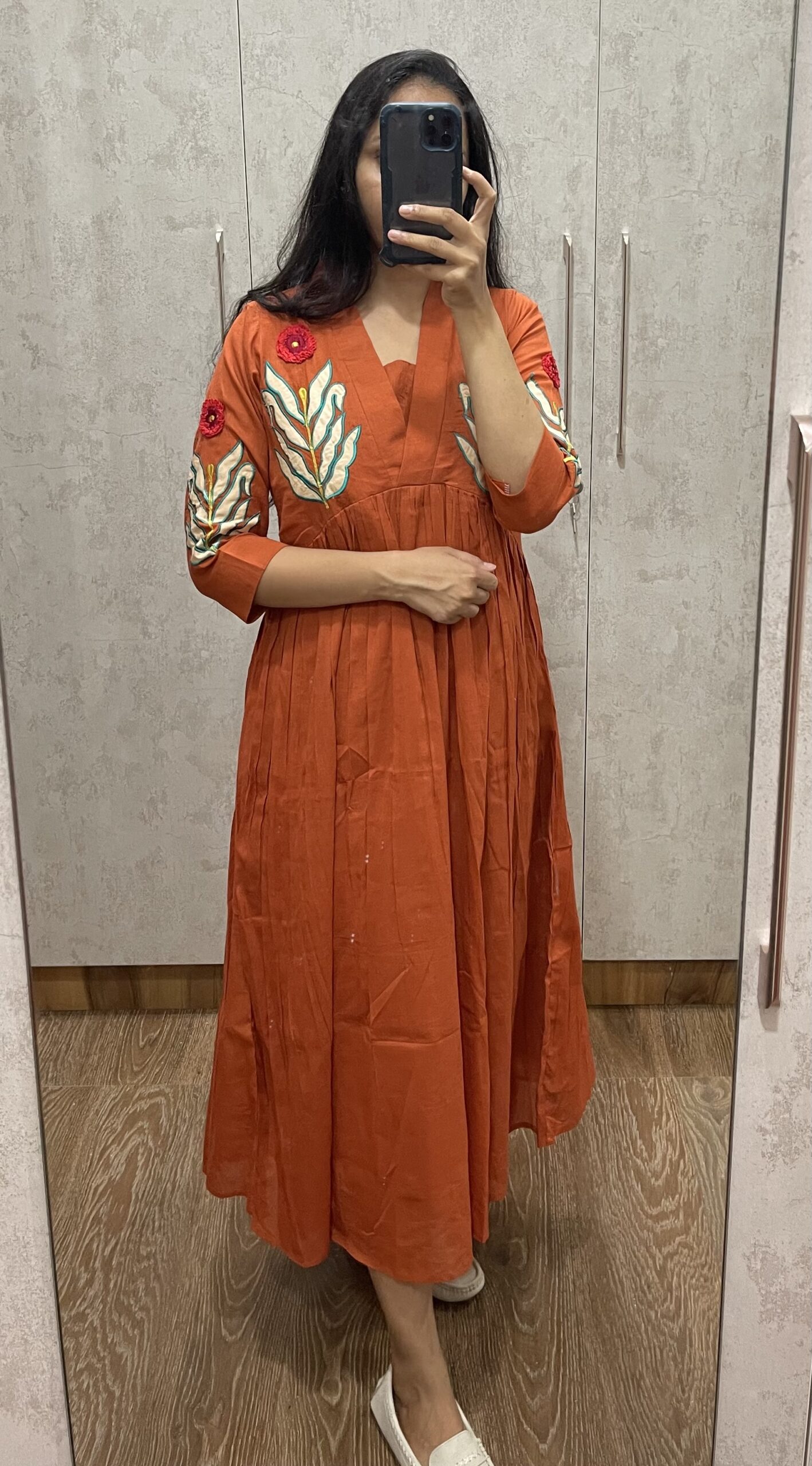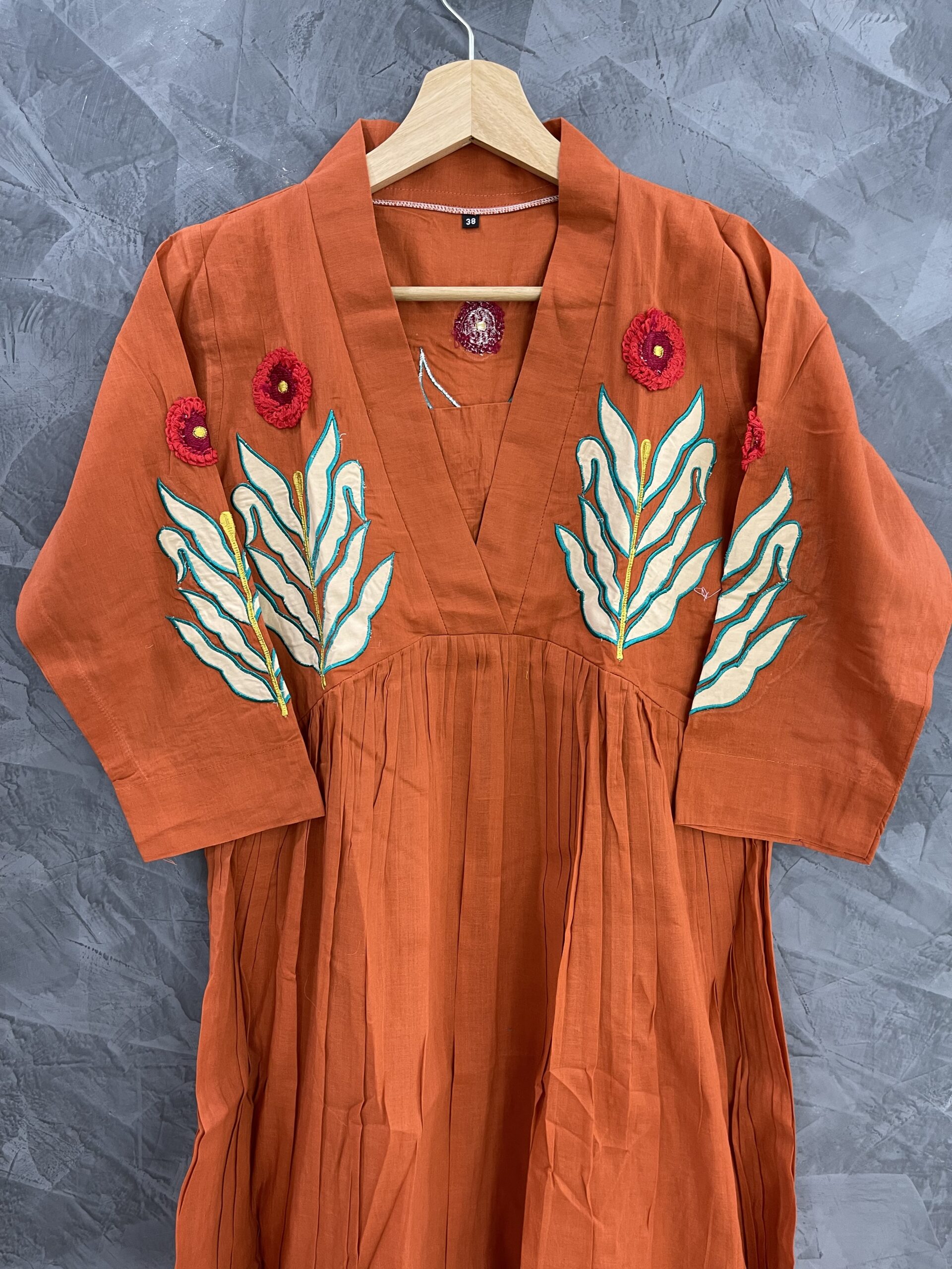 Dress is having beautiful hand embroidery of flowers on yoke and sleeves.
