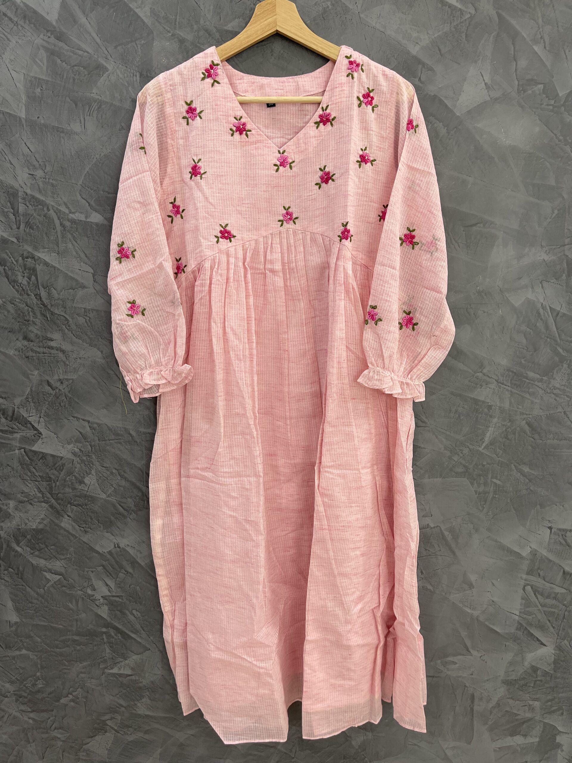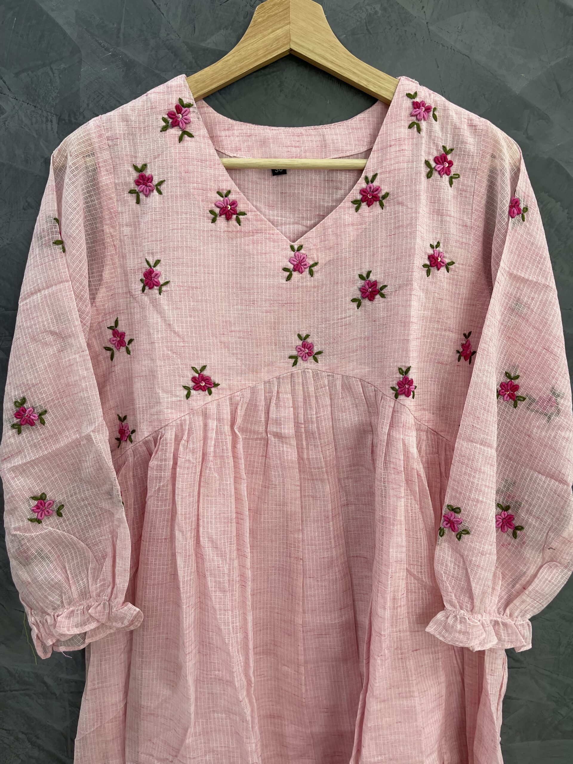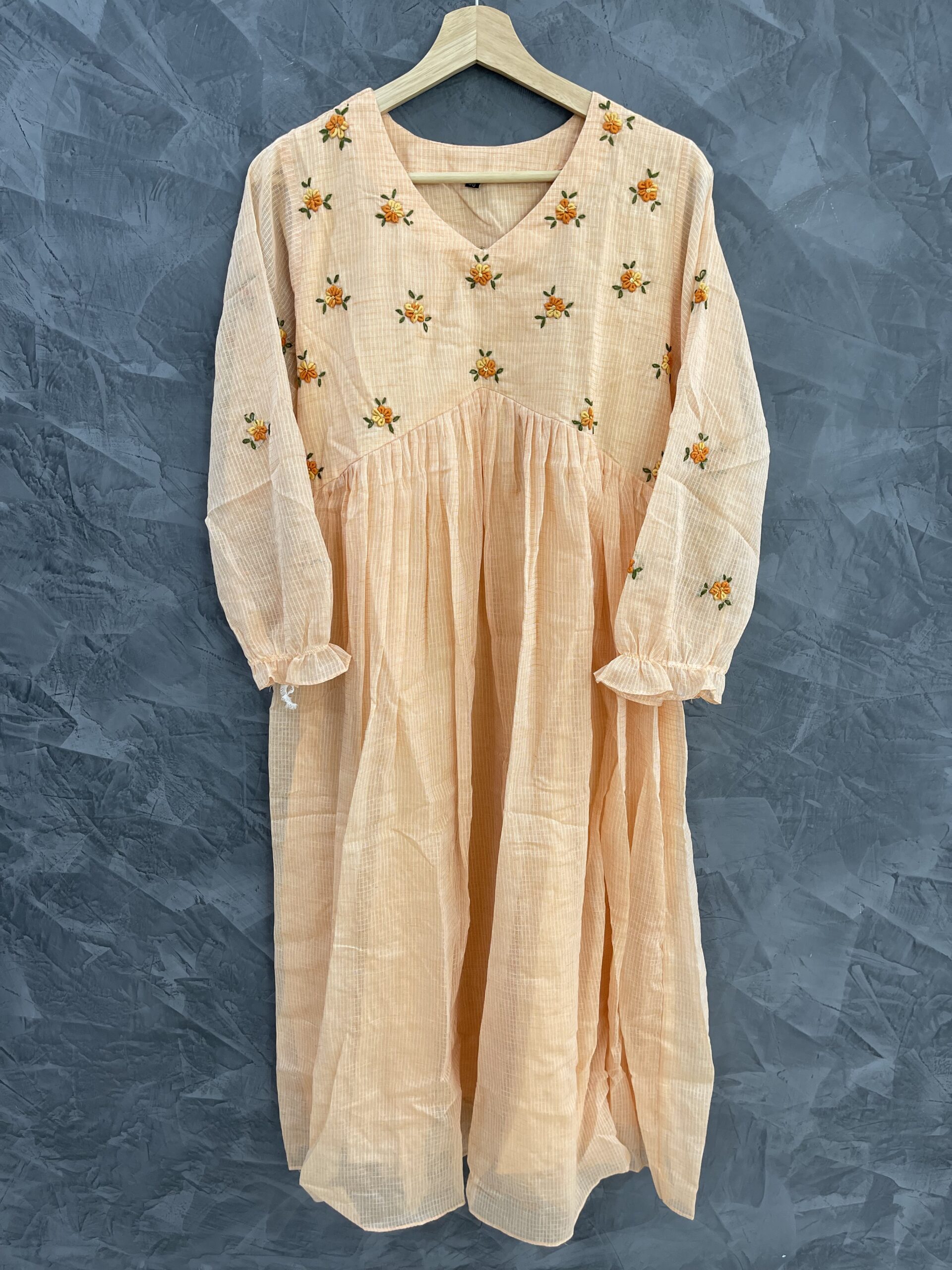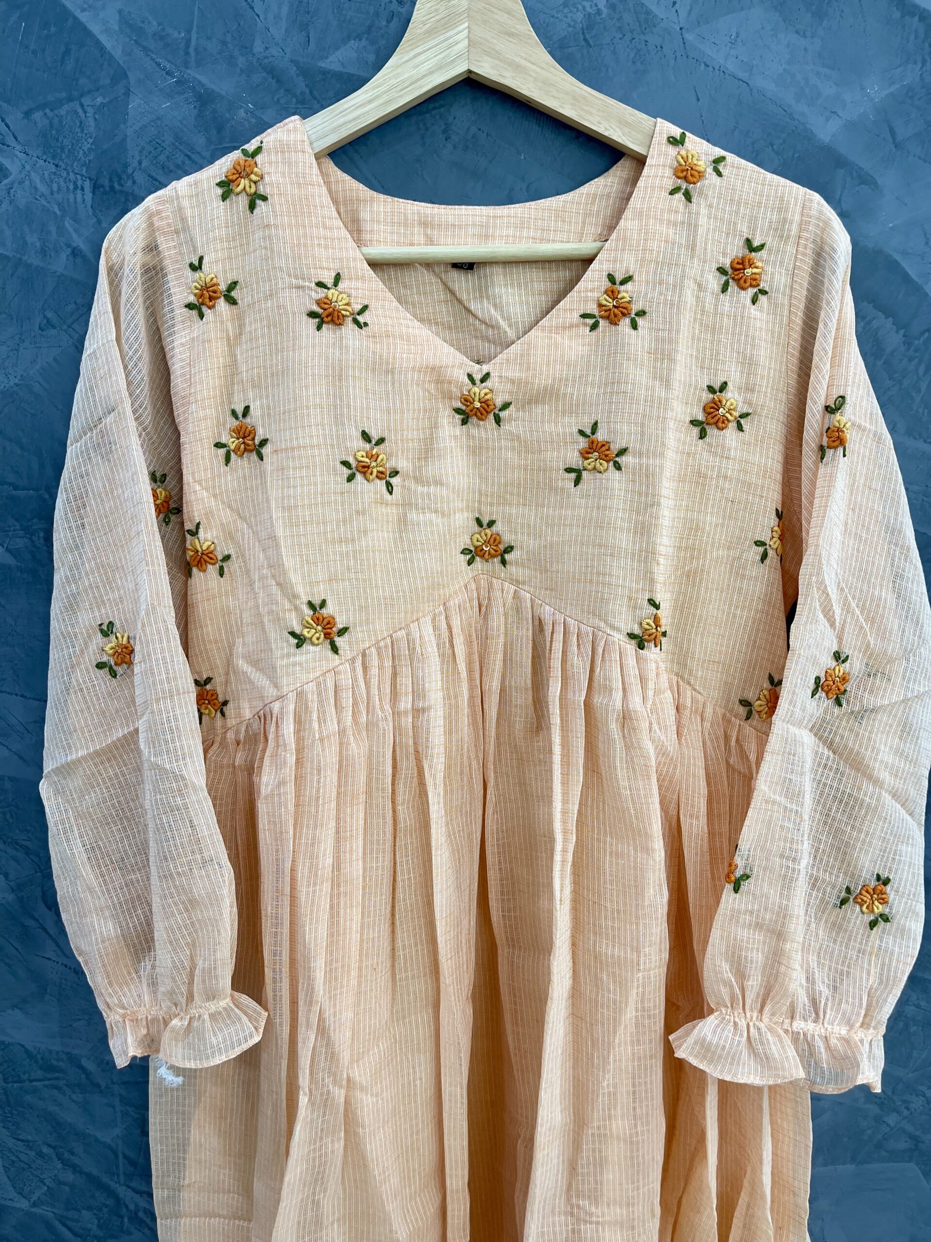 Dress is having beautiful hand embroidery of flowers on yoke and sleeves.
