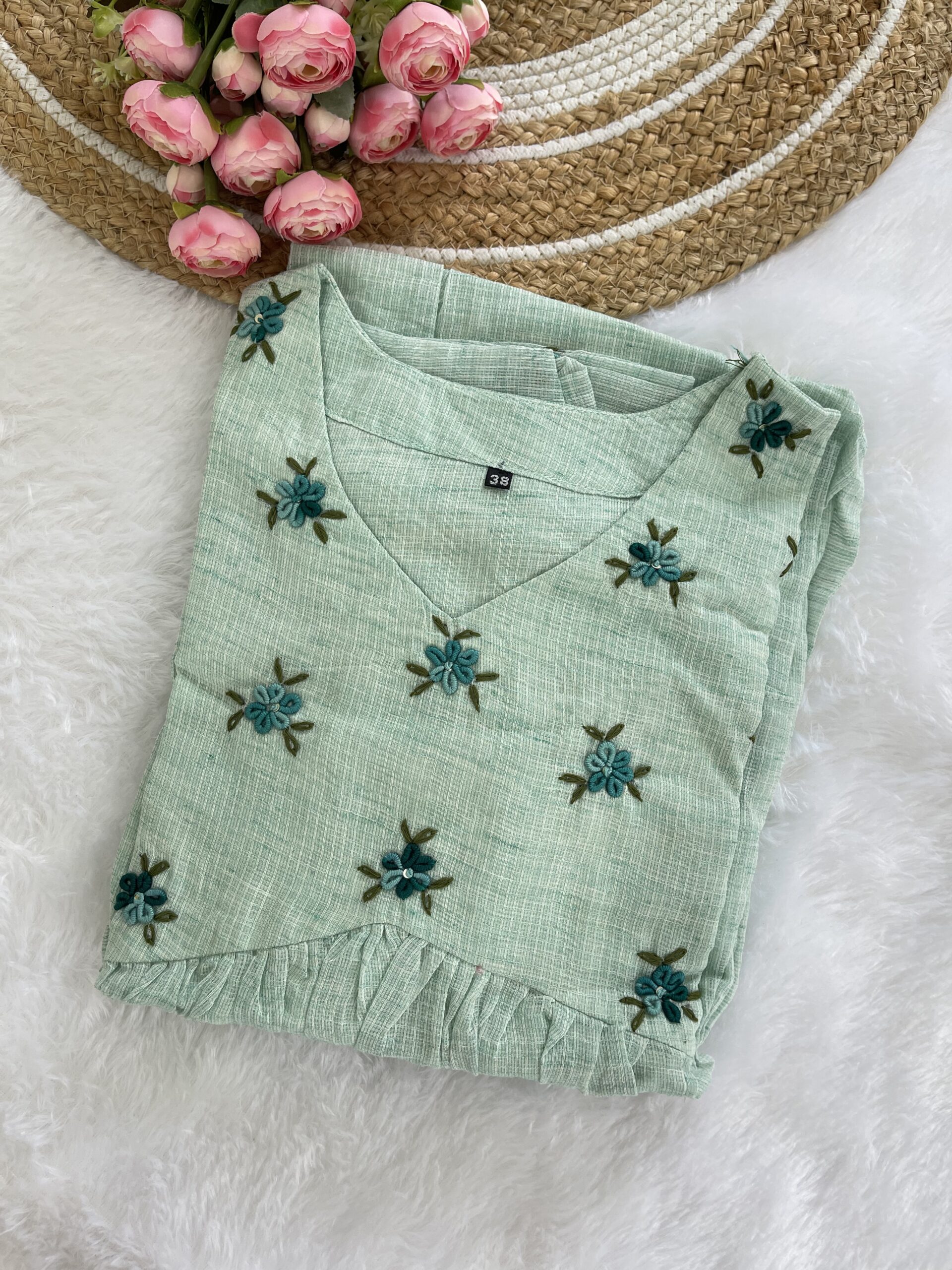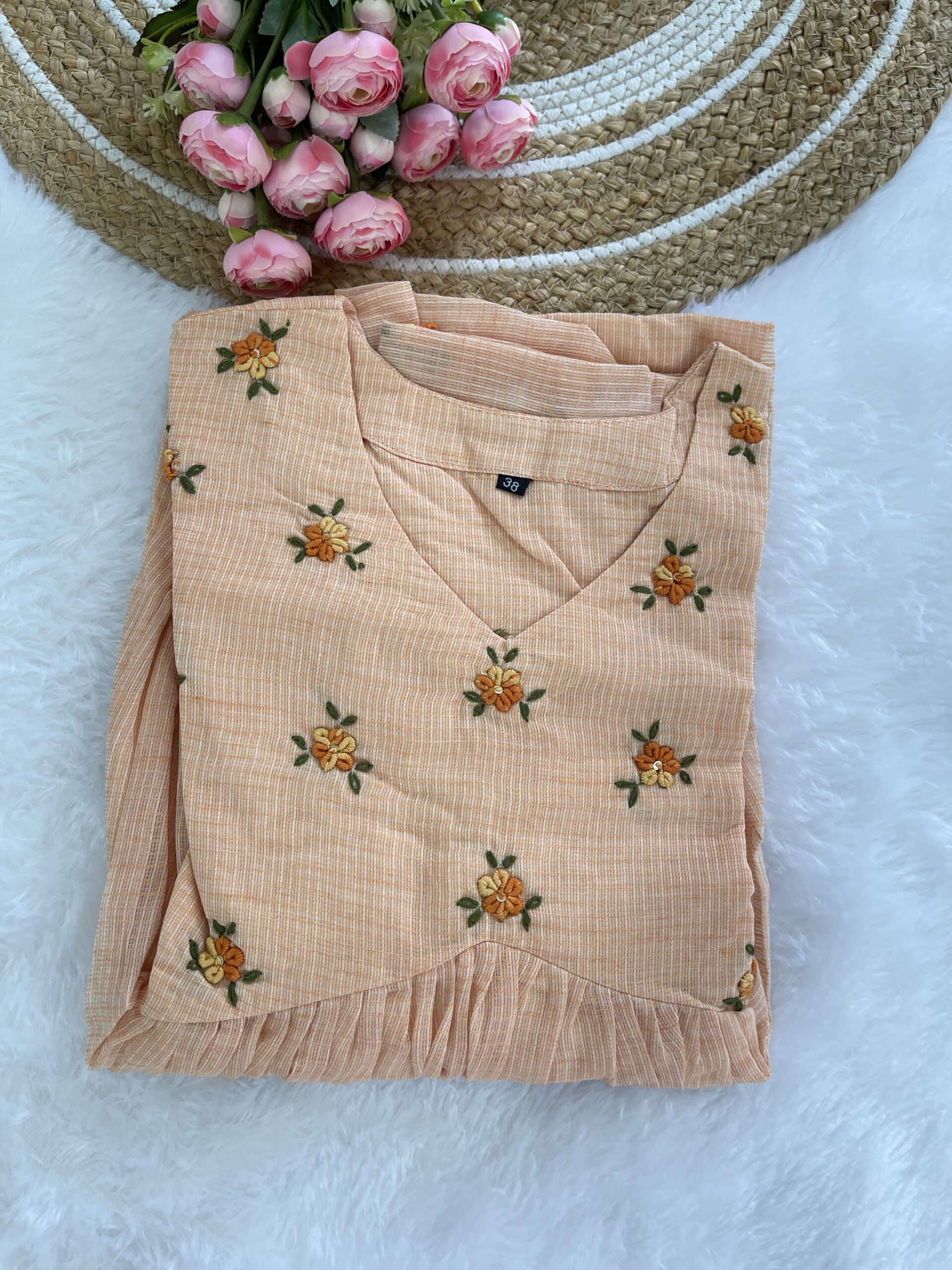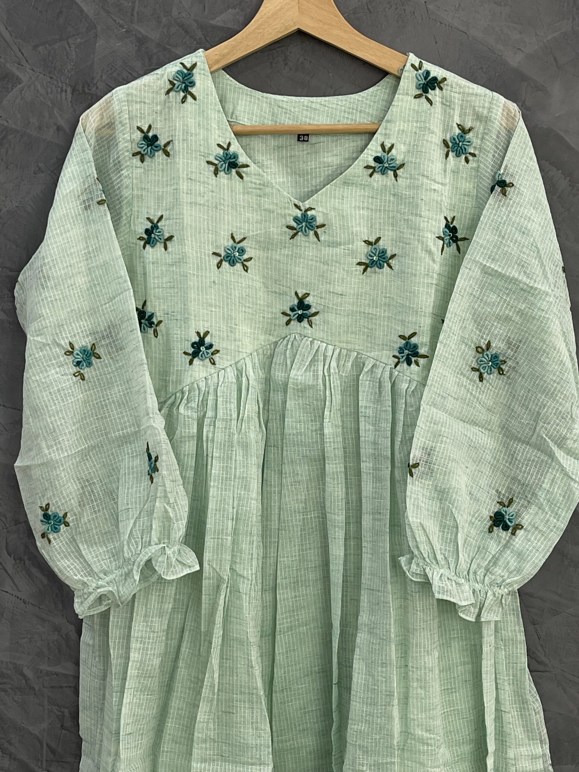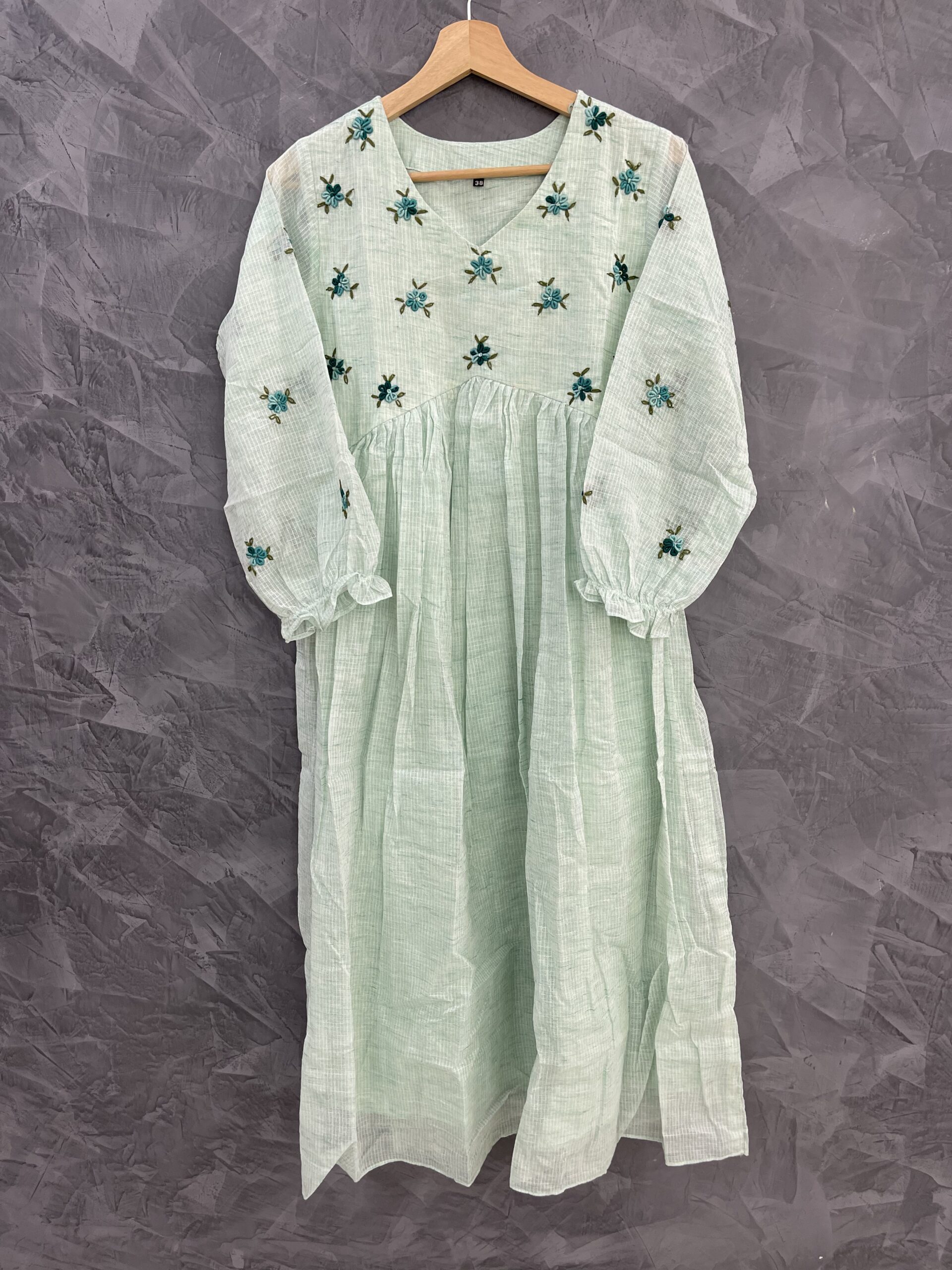 Dress is having beautiful hand embroidery of flowers on yoke and sleeves.